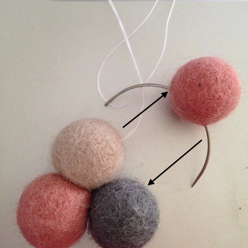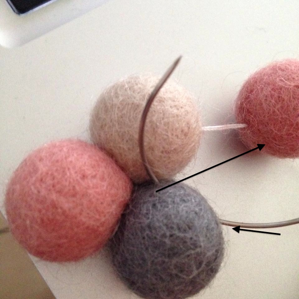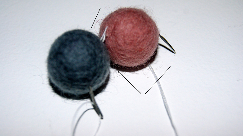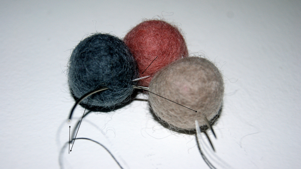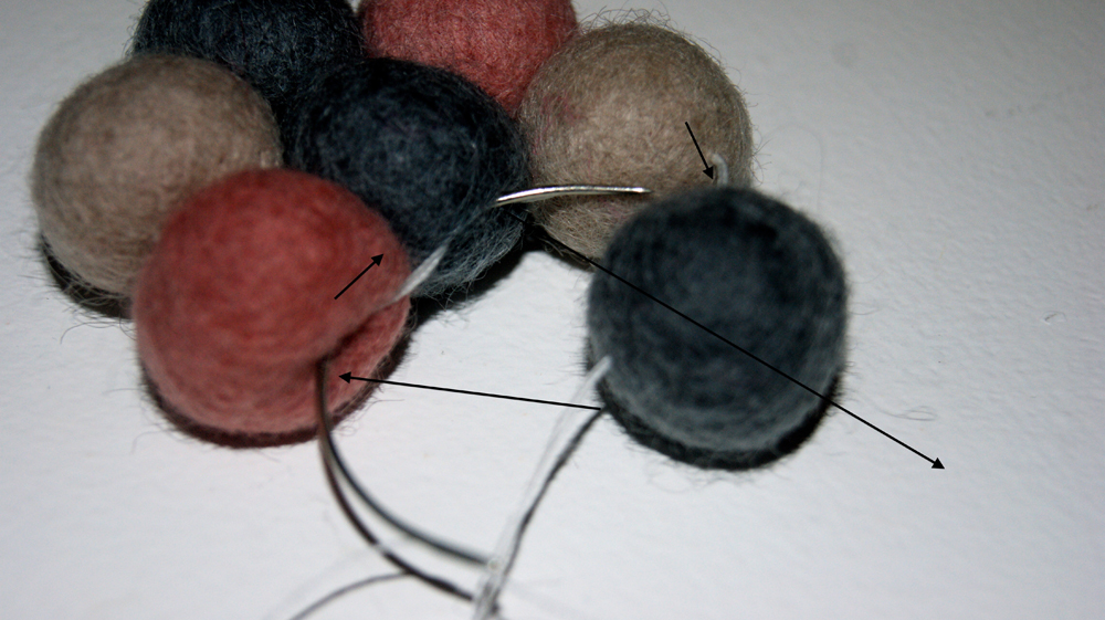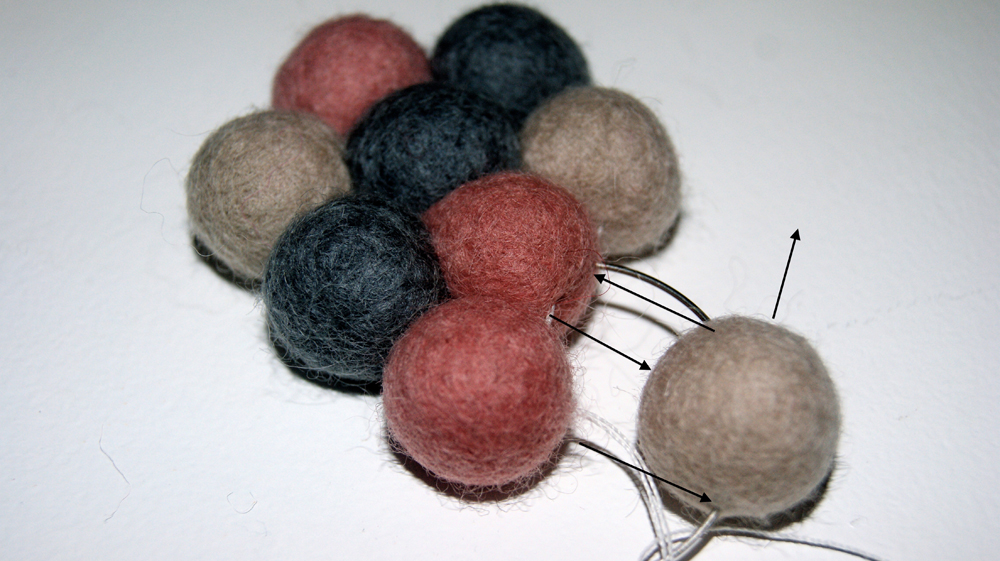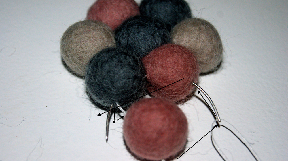 Ved brug af pile, kan du se, hvordan kuglerne er syet sammen. Det gÞr ikke noget, at du kan se trÄden, for den bliver helt skjult nÄr der kommer flere kugler pÄ.