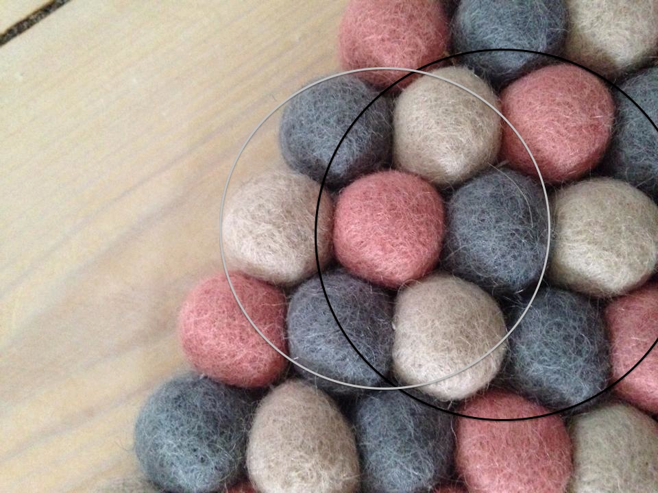 7. Den grĂ„ kugle danner pĂ„ dette billede centrum, og er dermed den indre âcirkelâ. NĂ„r den tredje skal syes pĂ„, er det vigtigt at du sĂžrger for, at den bliver festnet til kuglen ved bĂ„de kuglen ved siden af (den rĂžde kugle), og samtidig skal kuglen festnes til tĂŠppets centrum (den grĂ„ kugle).
