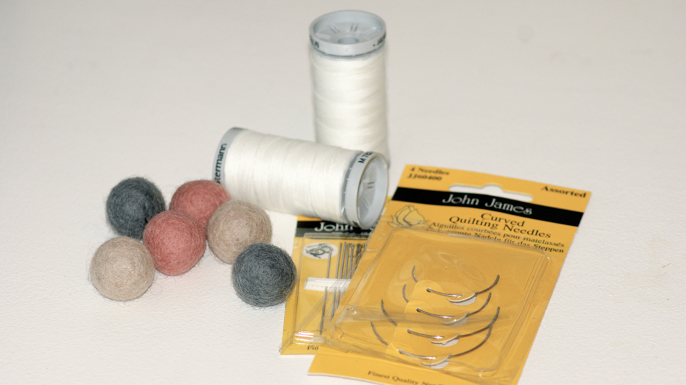 5. Du starter med at sy med den krumme nÄl, den bruges cirka til 90% af tÊppet. Den lige nÄl skal bruges til at stramme tÊppet op. Det er en fordel at bruge den lige nÄl, nÄr tÊppet skal strammes op, fordi det med den lige nÄl er lettere at komme direkte gennem kuglerne med den.
