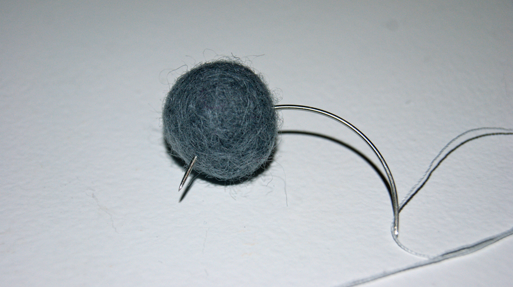 10. Derefter syer du igen igennem den ânyeâ kugle og ud i en vinkel pĂ„ 45 grader og nĂ„r snoren er ude pĂ„ den anden side, trĂŠkker du i den, sĂ„ det ser sĂ„dan ud: